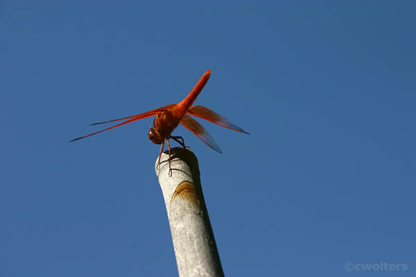 This morning I was working in the garden - my little garden patch. An orangy-red dragon fly had been around for a couple of days, and I remember thinking: I never saw an orange-red dragon fly before. So - it was there again this morning and picked this bamboo pole as a resting point. I don't know much about typical behavior for dragon flies. Maybe it was sun-bathing? Anyway, it flew away a few times, only to quickly return to that spot. I wished then I had my camera there. After a while, I decided to take a closer look and to say "High"...and we got acquainted...very cool. It seemed to be making some kind of nodding head movement. As I said, whatever it is that dragonflies do.... I worked some more and after about another hour, finally I told it: Ok if you want your picture taken, stay there and I'll be back with my camera. So I went up to the house and returned....it was still there. It allowed me to get pretty close - till I could see it's face...I don't know what you can see - but I see a smiling face. It was amazing. Nvm the things you can read into the face of an insect - but this guy seemed intelligent, funny, friendly...it was just great....I hope the pictures can convey some of it - as my words can't. I thought it was worth sharing.